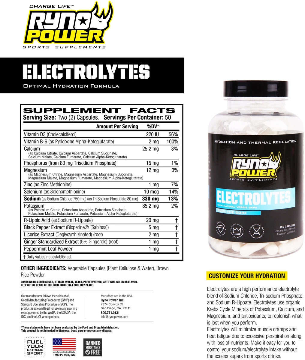 Our Electrolytes are a high-performance electrolyte blend of Sodium Chloride, Tri-Sodium Phosphate, and Sodium R-Lipoate. Electrolytes use Potassium, Calcium, Magnesium, and antioxidants to replenish what is used when you exercise.