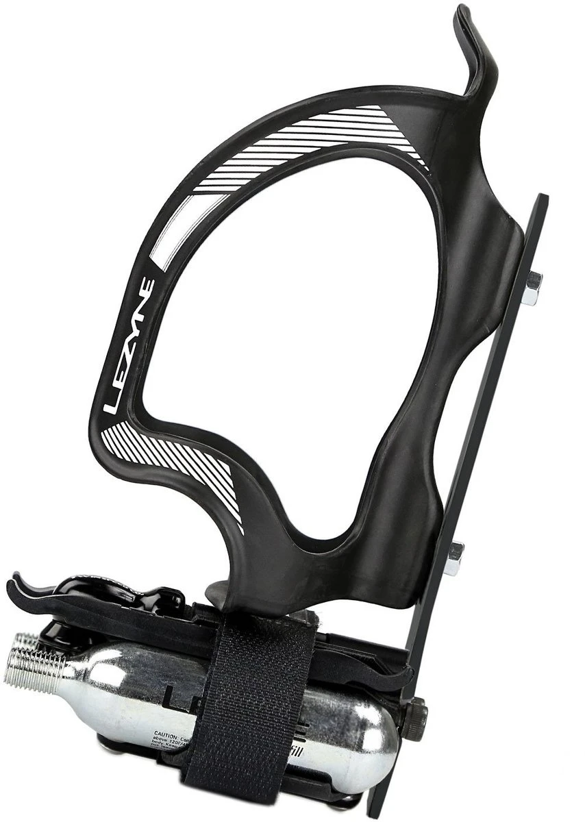 Integrated stainless steel storage bracket that fits under a bottle cage. Holds included Twin Speed Drive CO2 head, V5 multi tool, two CO2 cartridges and two Matrix levers. Not available with CO2 cartridges in all countries.