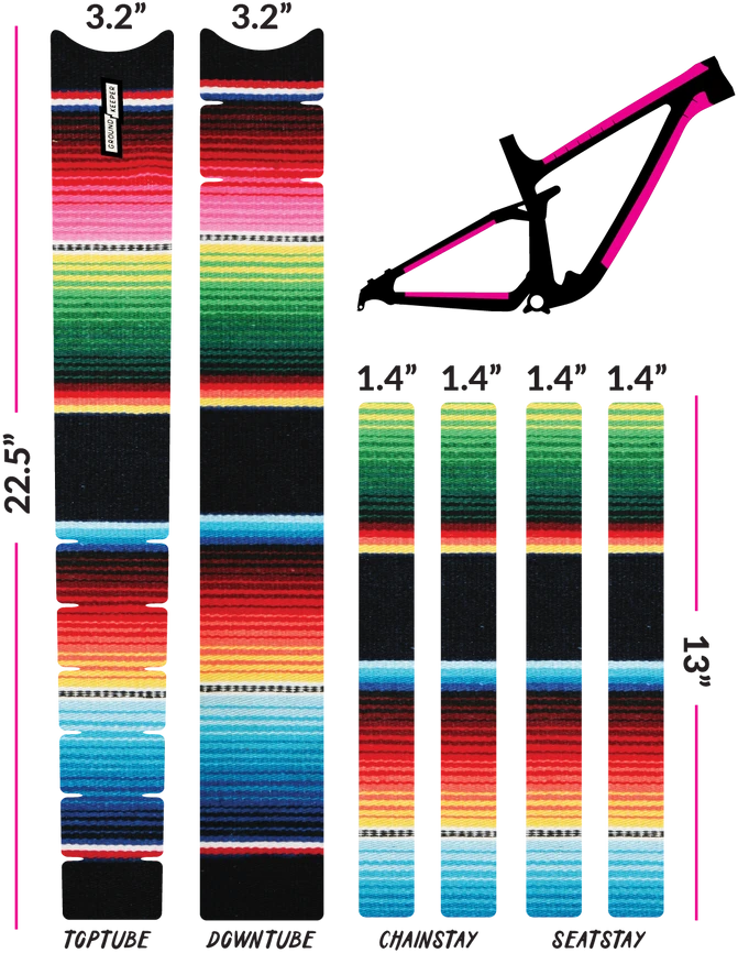 This bad hombre will bring the fiesta to the woods, setting off an all-black bike, or pairing well with a variety of blue, red, orange or green bikes. Frame protection is opaque so frame will not be visible under Frame Keeper.