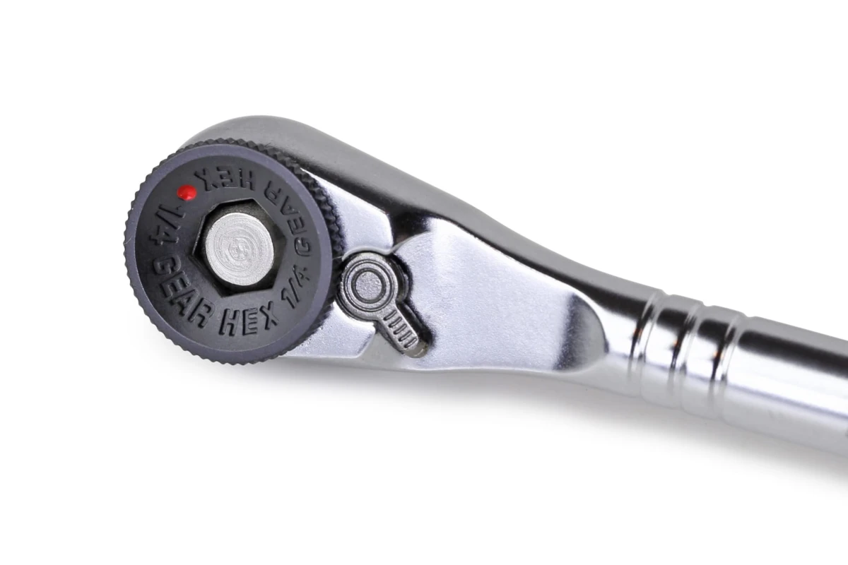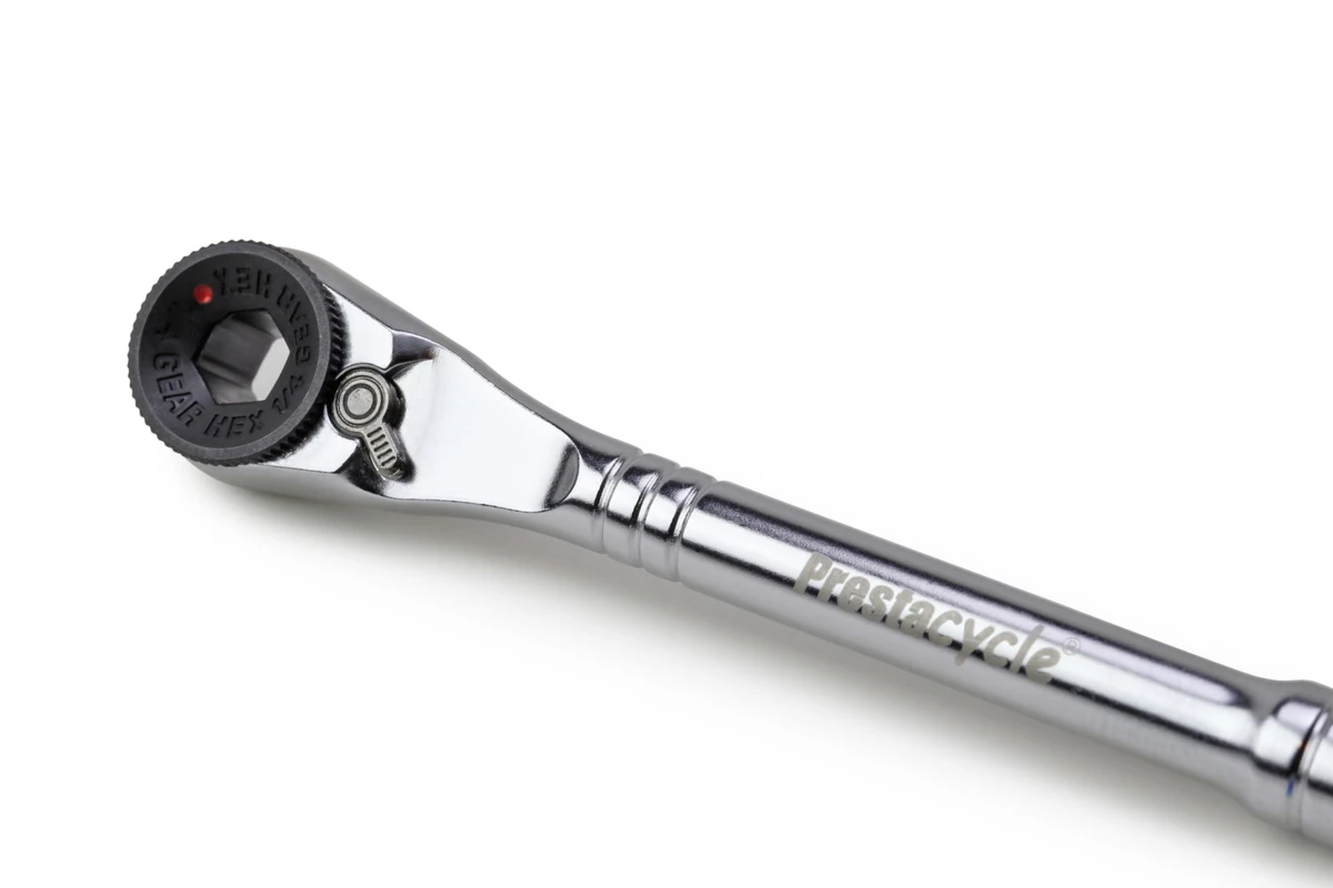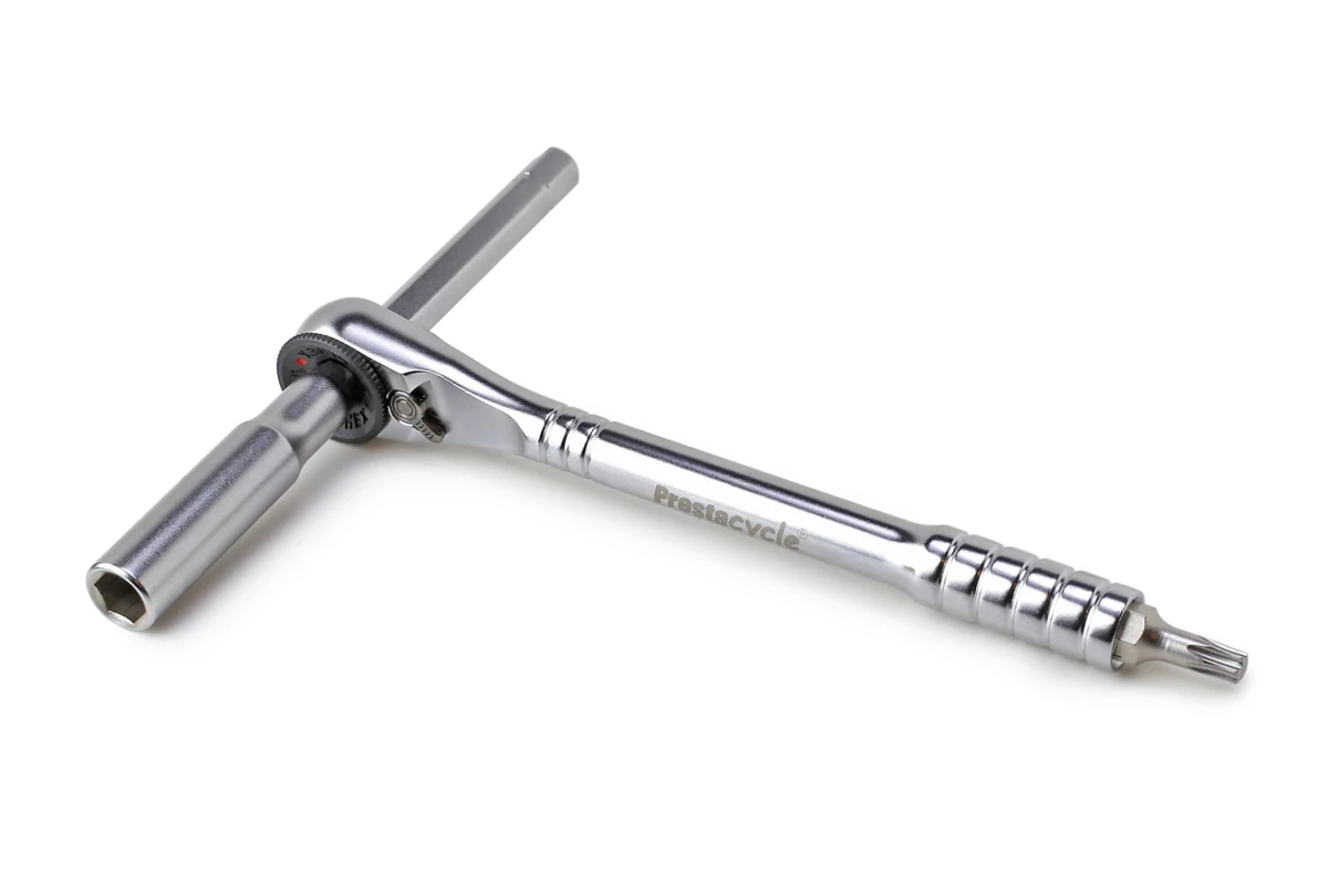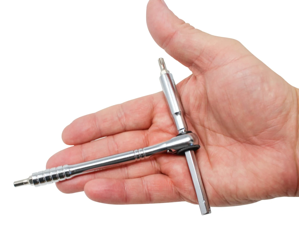 Prestacycle T-Handle 3 way Ratchet is compatible with all tool bit sets from Prestacycle and all standard ¼ bits. The patented Ratchet head firmly holds bits in place without a magnet. Releasing the bit is simple with a finger-press into the hole on the top. The ratchet offers an easy to use thumb wheel to speed screw installation and removal. The ratchet reverse knob is easily accessible right on top of the tool.