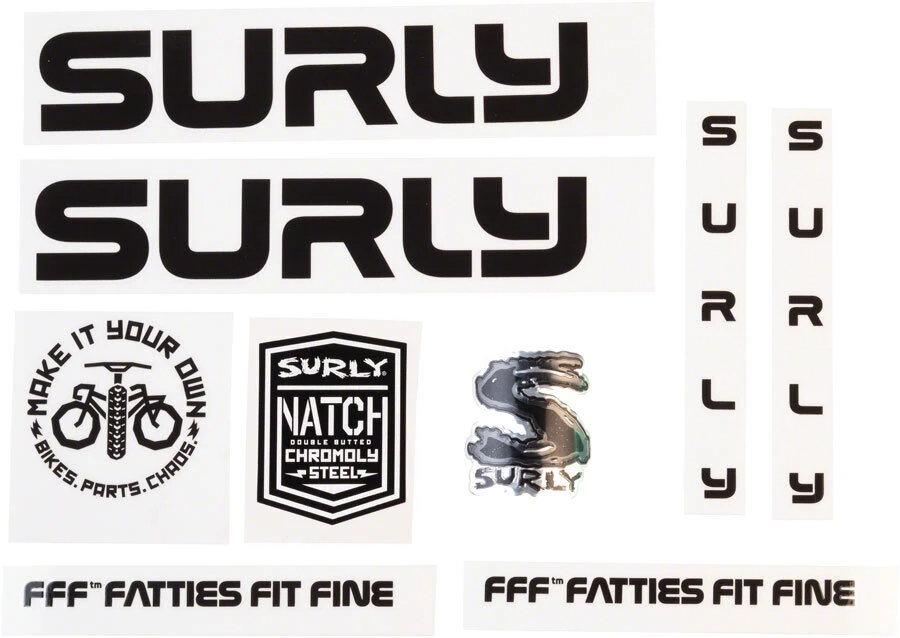 – Each set includes decals for the down tube, chainstays, and fork blades, a Surly Make It -your Own seat tube icon, Surly headbadge, and a ’Natch frame sticker