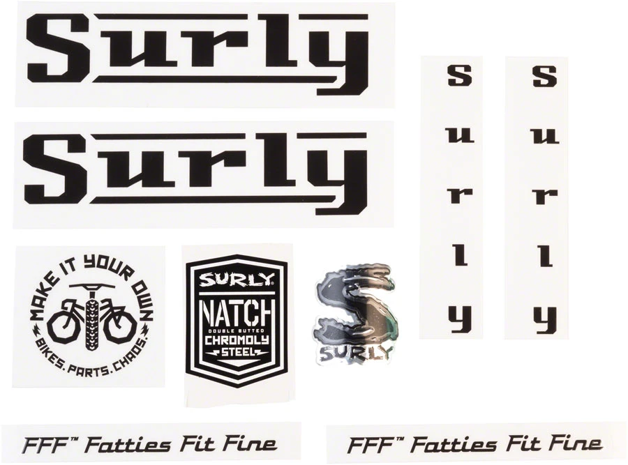 – Each set includes decals for the down tube, chainstays, and fork blades, a Surly Make It -your Own seat tube icon, Surly headbadge, and a ’Natch frame sticker