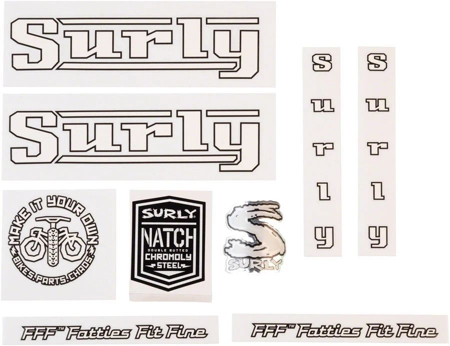 – Each set includes decals for the down tube, chainstays, and fork blades, a Surly Make It -your Own seat tube icon, Surly headbadge, and a ’Natch frame sticker
