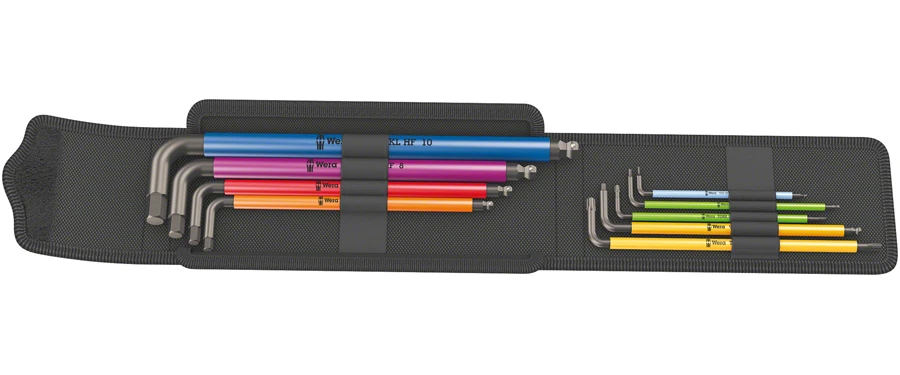 L-keys made from circular material with plastic sleeve for use on bicycles. The plastic sleeve makes working comfortable even at low temperatures and is easy on the fingers. All L-keys are easily accessible due to their color coding and size markings. For hexagonal socket screws and Torx screws. In a robust and lightweight folding pouch.